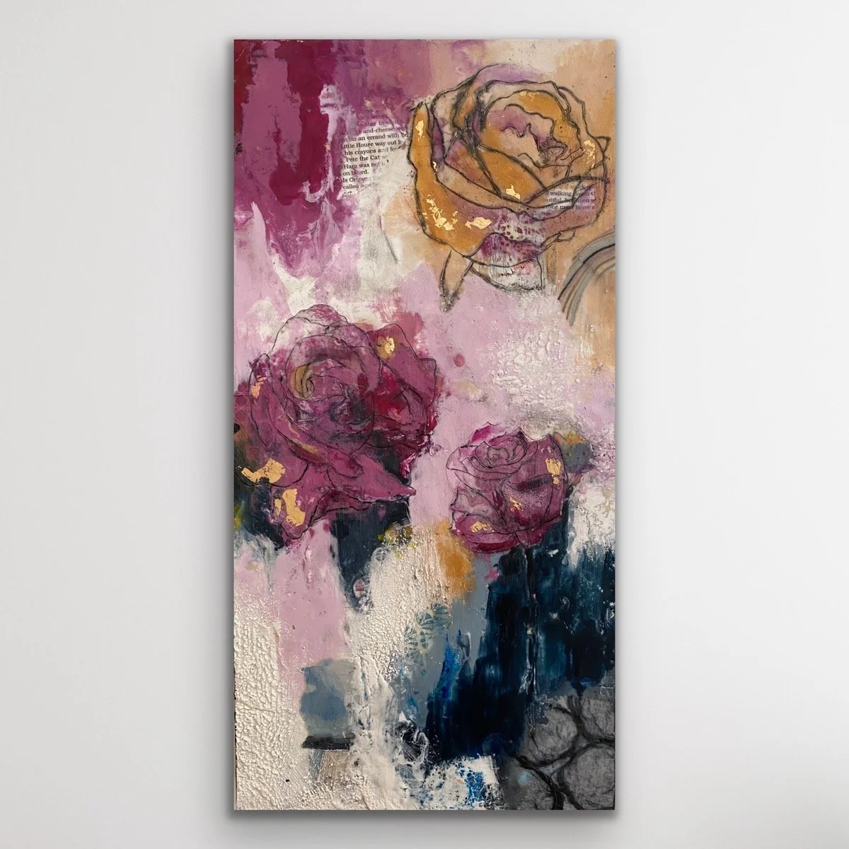 Encaustic mixed media piece. 24 × 12 cradled birch panel. Sides painted black. Wired and ready to hang.
